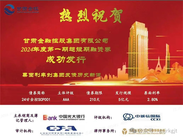 1月26日,甘肃金控集团成功发行2024年度第一期超短期融资券,发行规模5亿元,债券期限210天,票面利率2.80%,再创发行债券融资利率新低。