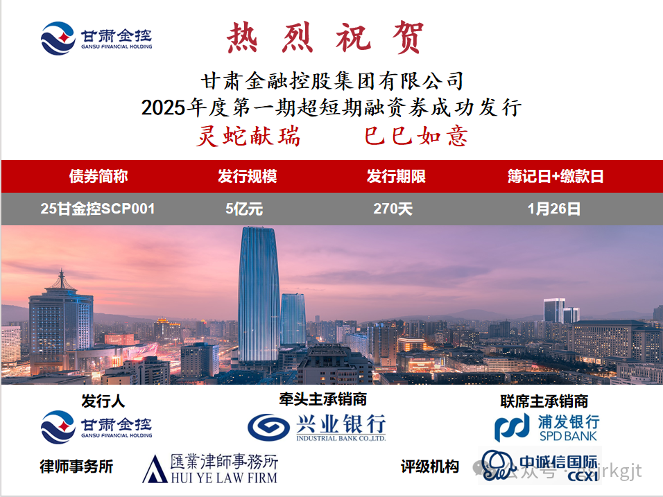 2025年1月26日,甘肃金控集团成功发行2025年度第一期超短期融资券,规模5亿元,期限270天。本笔项目是乙巳蛇年春节前全国最后一笔公开发行债券,受到了交易商协会、北金所、市场投资人的特别关注,有力提高了集团的市场知名度,也为集团后续债券发行开了好头!