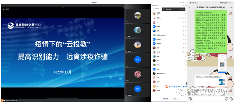 网络时代给我们的生活带来了极大的便利,但多数大龄投资者接受与使用网络工具的程度较低,风险识别能力不足,甘肃股权交易中心按照合格投资者年龄结构及使用偏好通过微信、腾讯会议等线上交流方式,组织投资者观看涉疫诈骗视频及案例。