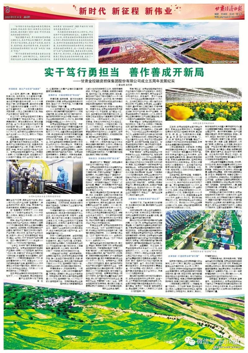 风雨兼程里铭刻奋发向上的印记,守正创新中开启奋楫扬帆的远征。自2018年5月成立以来,甘肃金控融资担保集团股份有限公司深入贯彻落实国家和省委省政府政策要求,按照甘肃金融控股集团有限公司工作部署,充分发挥政府性融资担保作用,积极健全政府性融资担保体系,进一步拓宽小微企业和“三农”主体融资渠道,服务全省重大战略、重要产业、重点项目,以覆盖全省的融资担保服务汇聚起惠企强农的磅礴力量,走出了一条具有甘肃特色的政府性融资担保路径。